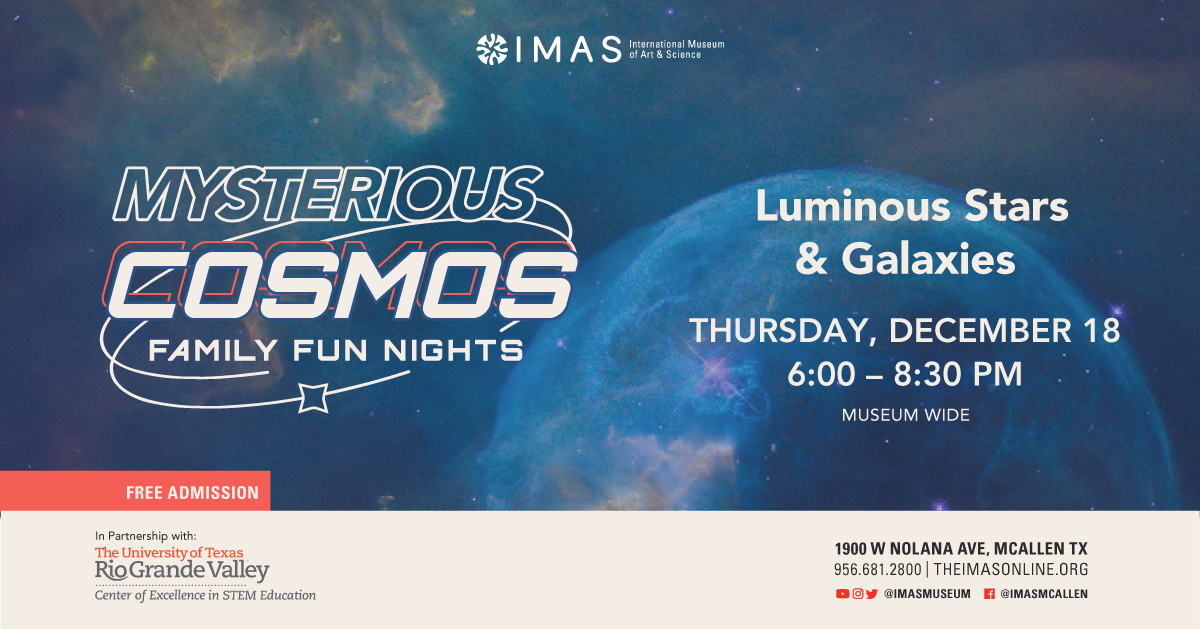 Drop into IMAS for Mysterious Cosmos Family Fun Nights this Fall & Winter season! Let gravity pull you in with your family and friends while learning about the cosmos through hands-on activities, presentations, and more! Don't forget to bring a foldable chair and enjoy the night sky as we look through telescopes provided by UTRGV's Center of Excellence in STEM Education.